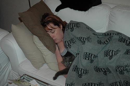 Häromkvällen var jag inte den piggaste av piggaste, så jag somnade synnerligen obekvämt i soffan. Grafitti tyckte visst att det var super för så här såg husse oss.