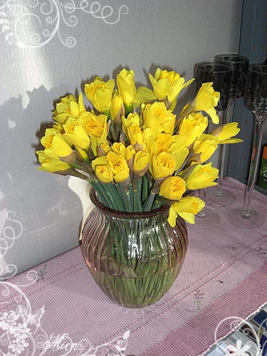 Ja, det blev väldigt lite påskpynt för oss i år. Inte för att det brukar vara en massa, på sin höjd ett påskris, men i år blev det en gul duk i köket samt en bukett med påskliljor.