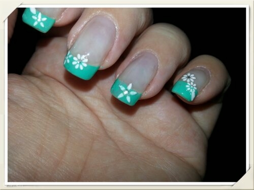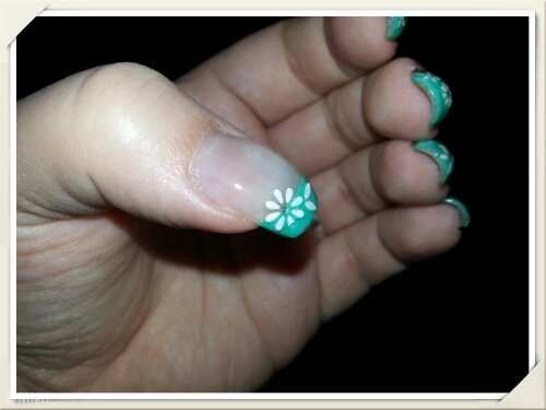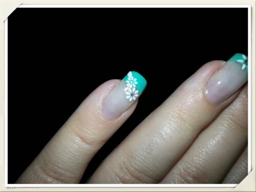 Jag har gjort tippar i grönt och dekorerat med vita skimrande blommor och blad. Skimret syns tyvärr inte så bra på bilderna. Vissa blommor har en liten blingsten i mitten. Blommorna har många år på nacken så varifrån dom kommer vet jag inte. Tipparna gjorde jag med lite hjälp av mallar från Mavala. Är inte helt nöjd med dom. Tippen blir för rak för min smak. Vet inte om det beror på att mallen är ganska stor eller om det är bågen som är för rak.