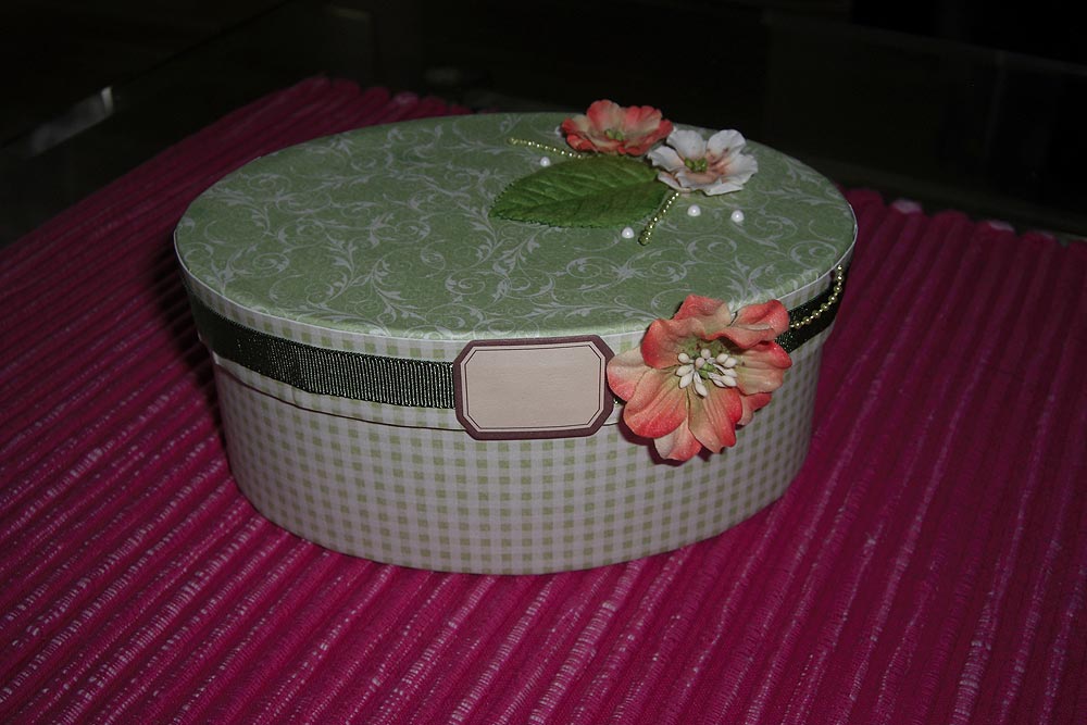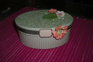 Ask klädd i papper med blommor och pearlmaker. Ca: 14 x 10cm. Höjd: 6 cm