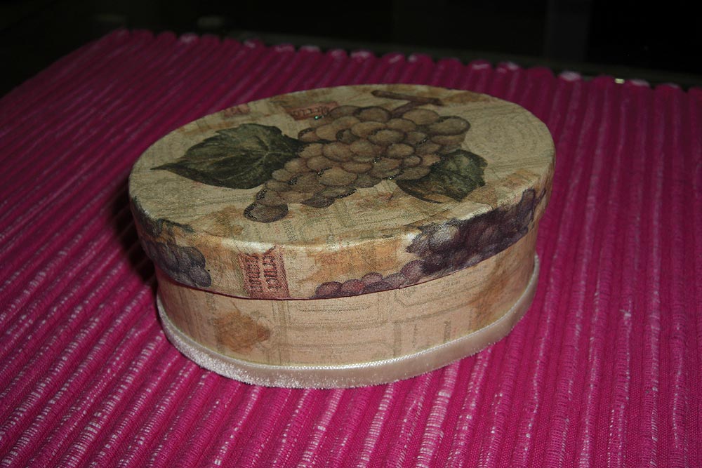 Ask klädd med decopage (servett), sametsband och glitter. Ca. 11 x 8 cm. Höjd: 4,5 cm