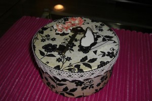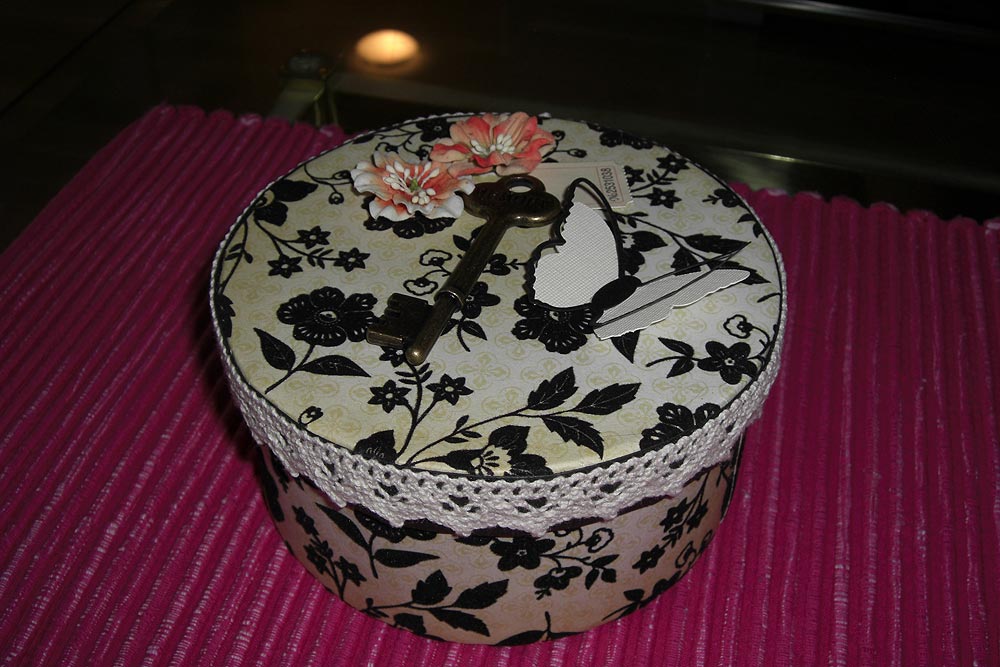 Rund ask klädd med sammetspapper, nyckel blommor och fjäril. Ca: 14 cm. Höjd: 7 cm