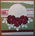 Der här fanns i paketet: Ett möstrat papper, en cardstock, svart självhäftande filtband, ljusblått band med stygn, smalt svart mockaband, rosor, hattnål, God Jul-skylt på tråd.