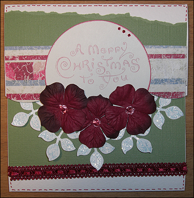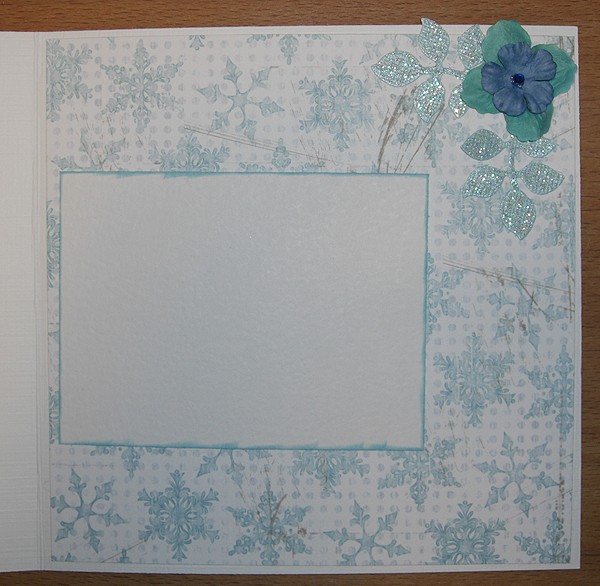 Dekorationer: Pappersros, Svart mockaband, Ljusblått band med söm, Hattnål, God Jul-skylt, Glitterpenna, Perfect pearl (perfect gold), Stickles (Turquoise)