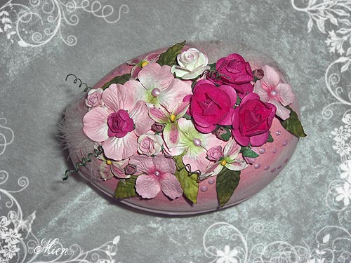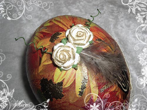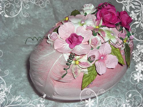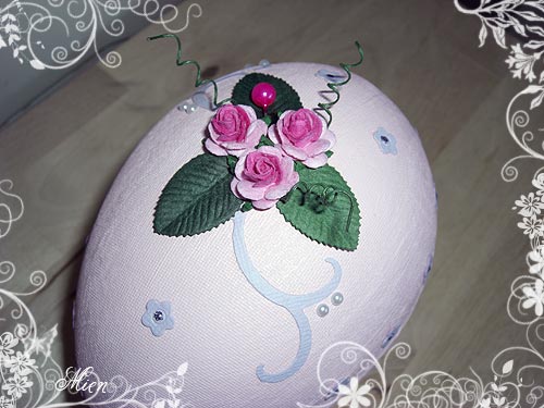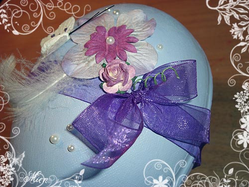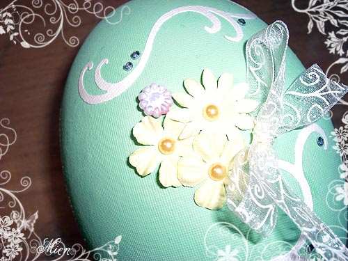Jag stansade ut en cirkel (ca: 3″) och använde sedan en embossingfolder för att få ett mönster på den. Innan jag la i cirkeln i foldern duttade jag på insidan av foldern med en turkos stämpeldyna för att få ett färgat tryck. När cirkeln var embossad sprayade jag den med perfect pearl för en lite glittrig effekt.