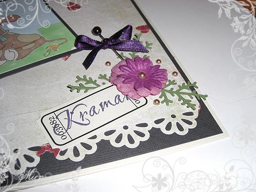 Den är enkel, men jag ttycker ändå att den förmedlar kärlek. Spetskanten har jag gjort med hjälp av en stans, och swirlen samt hjärtan är målade med rosa akrylfärg och sedan massor med Distress crackle paint. Och halvpärlor (peralmaker) inte att förglömma.