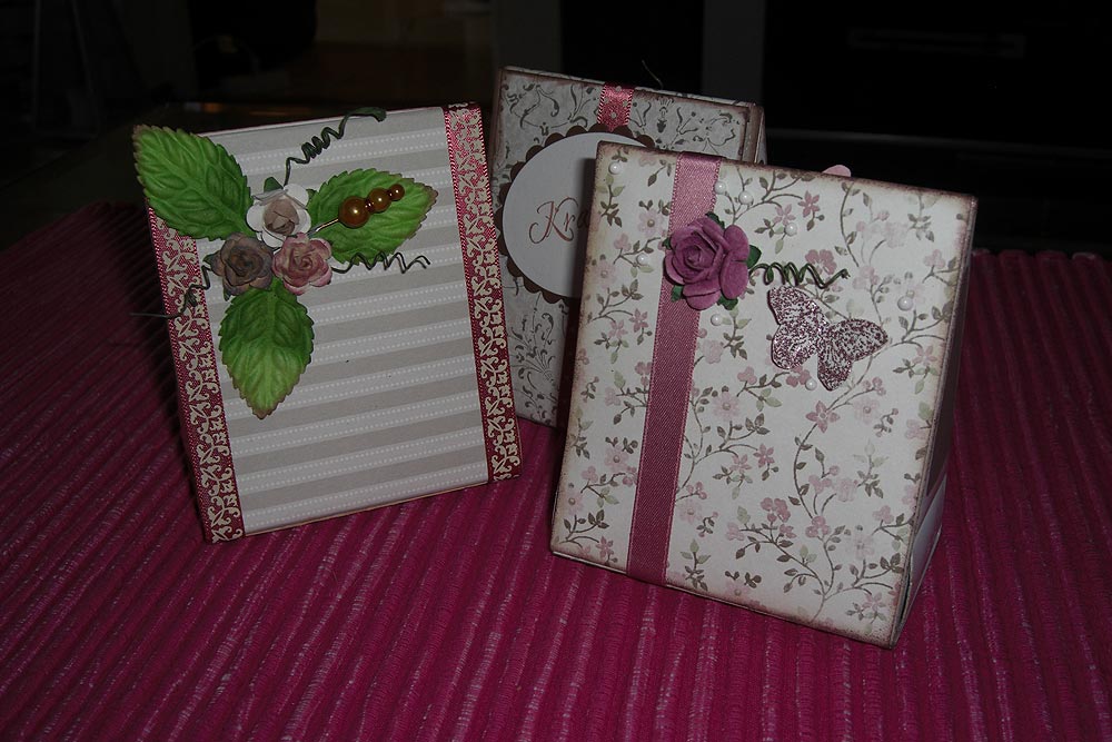 Tändsticksaskar i rolig form. Klädda med papper, band och blommor. Ca: 10 cm höga. Enhetspris (ett pris oavsett ask)