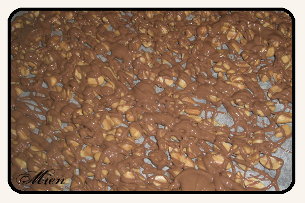 Strössla ut en massa salta jordnötter på en plåt och ringla sedan över smällt mjölkchoklad. Låt stelna och bryt sedan sönder och förvara svalt.